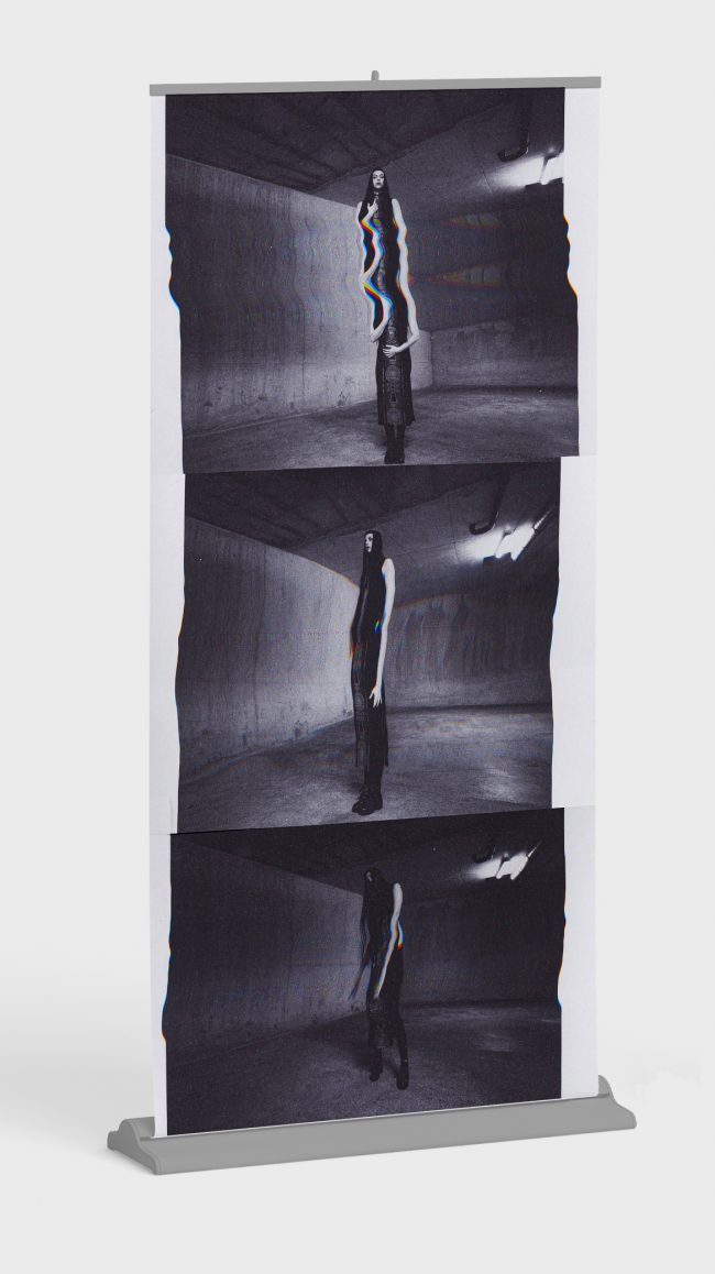 À travers la performance, des projections apparaissent à plusieurs niveaux au-dessus du spectateur.ice, à la manière de « pop-up » agressifs rappelant l’esthétique net.art, s’intensifiant au fur et à mesure de l’invocation d’une « entité digitale supérieure”. Les deux artistes, qui ne se sont jamais rencontré.es, proposent ainsi de créer et générer un nouvel espace de communication et d’exploration des tensions entre nos émotions, intuitions et des éléments non-humains. L’IA devient un.e médiateur.ice, guide, outil, permettant de transcender les pratiques anciennes pour proposer des pistes d’approches fluides, fragmentées et multiples, plus adaptées à nos identités cyborgs post-modernes.